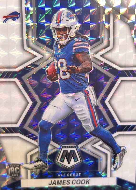 The James Cook 2022 Mosaic #285 NFL Debut - White /25 Rookie card in Raw condition has not changed in price in the last 30 days and was last sold for $79.00 .