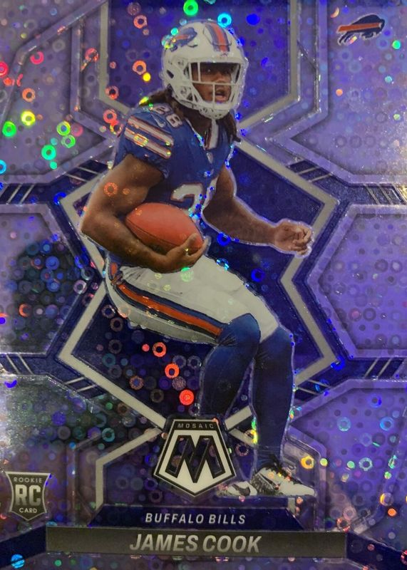 The James Cook 2022 Mosaic #309 No Huddle Rookie card in Raw condition has moved up $0.50 (+6.7%) in the last 30 days and was last sold for $8.00 .