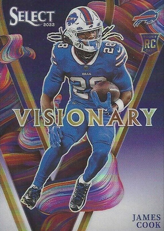 The James Cook 2022 Select #VIS-25 Visionary /(SSP) Rookie card in Raw condition has not changed in price in the last 30 days and was last sold for $13.36 .