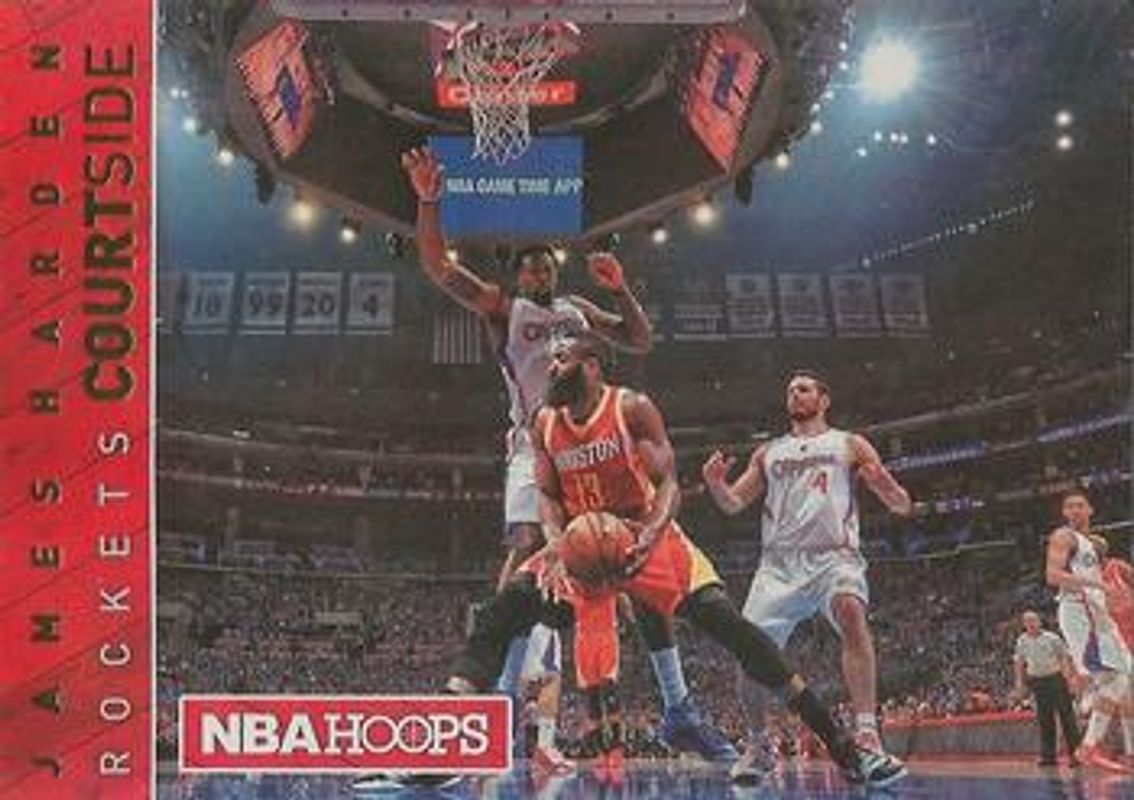 The James Harden 2015 Hoops #10 Courtside card is 1 of 32 James Harden's card variations in the 2015 Hoops set being tracked by Sports Card Investor, including Base, Gold, Green, Red Back, and Blue /399.