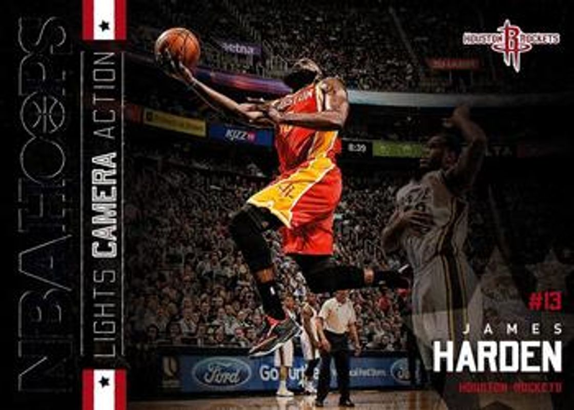 The James Harden 2015 Hoops #11 Lights...Camera...Action! card is 1 of 32 James Harden's card variations in the 2015 Hoops set being tracked by Sports Card Investor, including Base, Gold, Green, Red Back, and Blue /399.