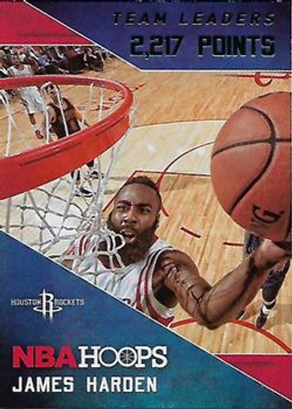 The James Harden 2015 Hoops #12 Team Leaders card is 1 of 32 James Harden's card variations in the 2015 Hoops set being tracked by Sports Card Investor, including Base, Gold, Green, Red Back, and Blue /399.