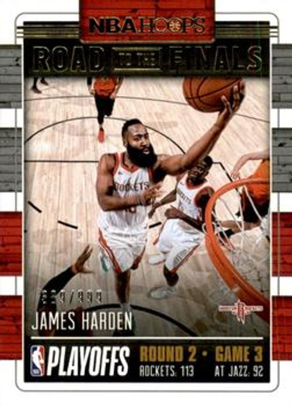 The James Harden 2018 Hoops #55 Road to the Finals /2018 card is 1 of 45 James Harden's card variations in the 2018 Hoops set being tracked by Sports Card Investor, including Base, Red Backs, Premium Boxed Set /199, Action Shots, and ARCeologists.