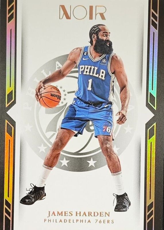 This card is 1 of 13 James Harden's card variations in the 2022 Noir set being tracked by Sports Card Investor, including Association Edition /99, Icon Edition /99, Statement Edition /25, Association Edition - Holo Silver /49, and Icon Edition - Holo Silver /49.