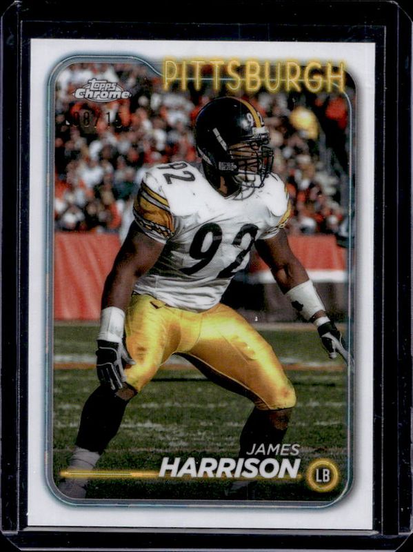 The James Harrison 2024 Topps Chrome Sapphire Edition #163 White /15 card is 1 of 12 James Harrison's card variations in the 2024 Topps Chrome Sapphire Edition set being tracked by Sports Card Investor, including Base, Gold /50, Orange /25, Purple /10, and Red /5.