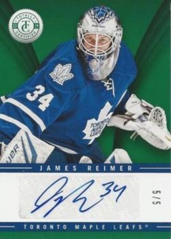 The James Reimer 2013 Totally Certified #TS-JRE Signatures Green /5 card is 1 of 3 James Reimer's card variations in the 2013 Totally Certified set being tracked by Sports Card Investor, including Signatures, and Signatures Green /5.