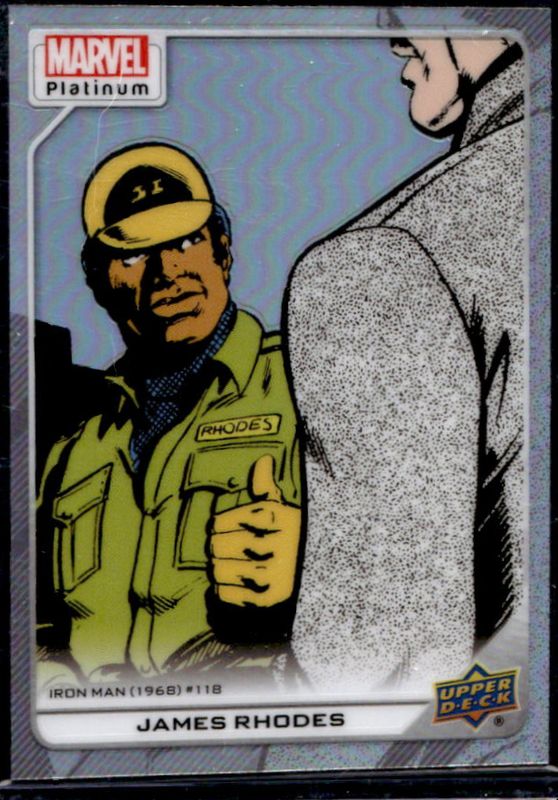 The James Rhodes 2023 Upper Deck Marvel Platinum #122 Rainbow card is 1 of 30 James Rhodes' card variations in the 2023 Upper Deck Marvel Platinum set being tracked by Sports Card Investor, including Base, Black Rainbow, Blue Rainbow, Blue Surge, and Purple Rainbow.