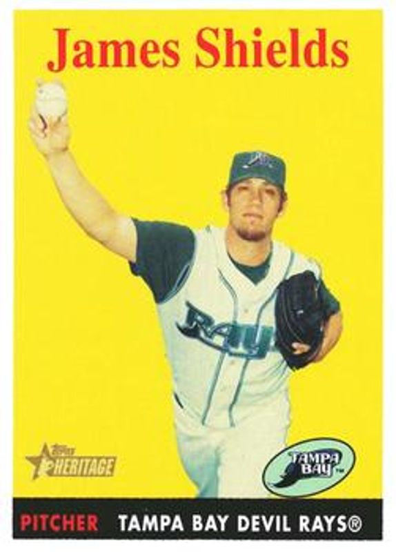 The James Shields 2007 Topps Heritage #237 Base card is 1 of 4 James Shields' card variations in the 2007 Topps Heritage set being tracked by Sports Card Investor, including Chrome /1958, Chrome Refractor /558, and Chrome Black Refractor /58.