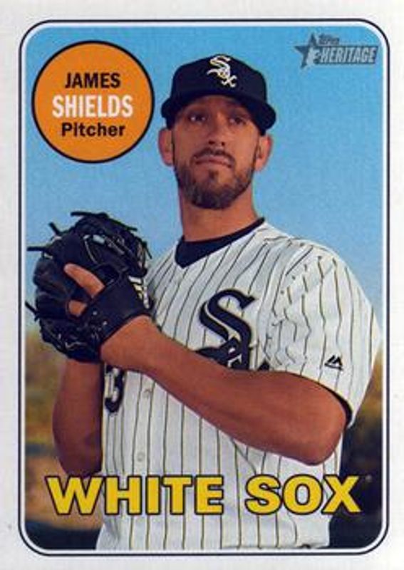The James Shields 2018 Topps Heritage #308 Base card is 1 of 7 James Shields' card variations in the 2018 Topps Heritage set being tracked by Sports Card Investor, including 100th Anniversary, Black Border, Magenta Backs, Reverse Stock, and 5x7 /49.