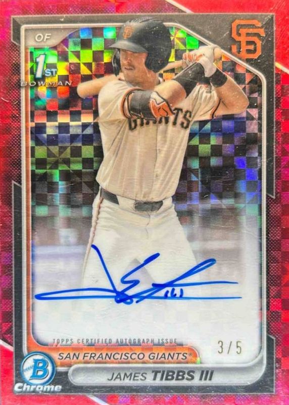 The James Tibbs III 2024 Bowman Draft #CPA-JT Chrome DP Auto - Red X-Fractor /5 (1st) card in Raw condition has not changed in price in the last 30 days and was last sold for $133.38 .
