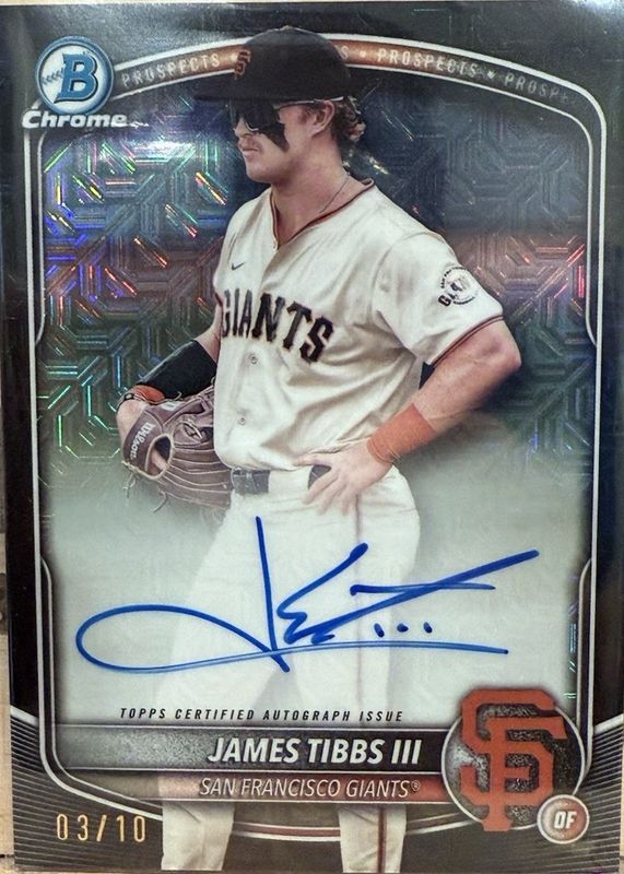 This card is 1 of 8 James Tibbs III's card variations in the 2025 Bowman Mega Box set being tracked by Sports Card Investor, including Chrome Prospect Auto, Chrome Prospect Auto - Purple Refractor /250, Chrome Prospect Auto - Blue Refractor /150, Chrome Prospect Auto - Green Refractor /99, and Chrome Prospect Auto - Gold Refractor /50.