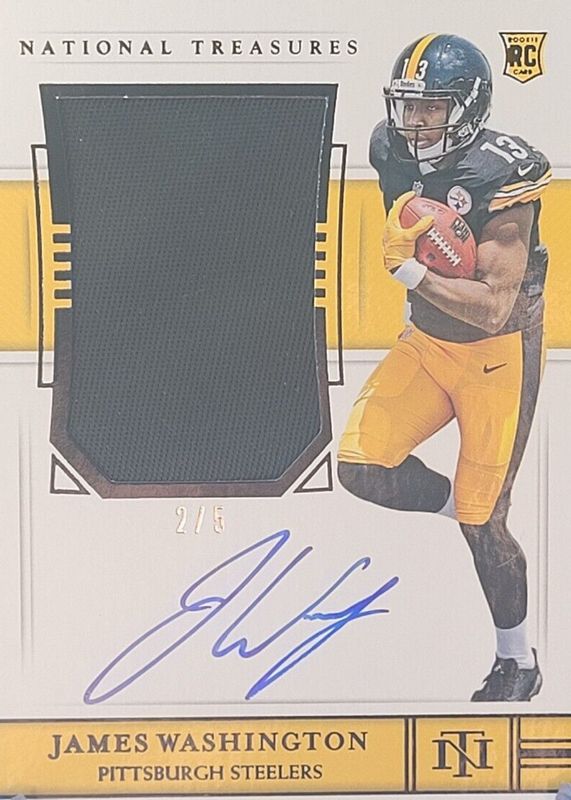 This card is 1 of 12 James Washington's card variations in the 2018 National Treasures set being tracked by Sports Card Investor, including Rookie Patch Auto /99, Rookie Patch Auto - Green Jersey Number (/13), Rookie Patch Auto - Holo Silver /25, Rookie Patch Auto - Midnight /20, and Rookie Patch Auto - Stars & Stripes /15.