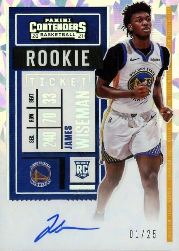 This card is 1 of 28 James Wiseman's card variations in the 2020 Contenders set being tracked by Sports Card Investor, including Rookie Ticket Auto (Running), Rookie Ticket Auto - Clear Ticket (Running), Rookie Ticket Auto - Premium (Running), Rookie Ticket Auto - Premium Green Shimmer (Running), and Rookie Ticket Auto - Ticket Stub (/33 - Running).