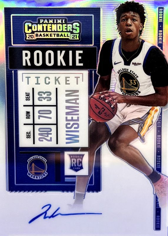 The James Wiseman 2020 Contenders #115 Rookie Ticket Auto Variation - Premium (Two Hands on Ball) card in Raw condition has not changed in price in the last 30 days and was last sold for $20.00 .