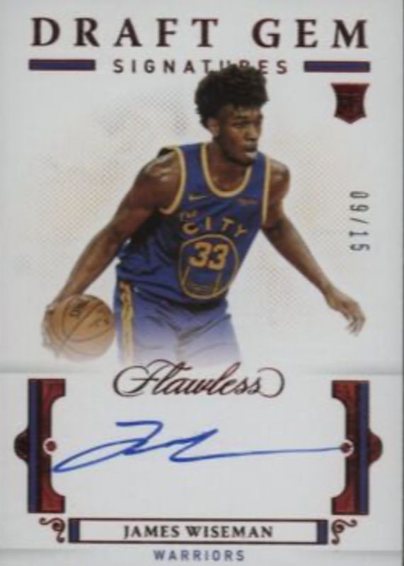 The James Wiseman 2020 Flawless #DG-JWM Draft Gem Signatures - Ruby /15 Rookie card in Raw condition has not changed in price in the last 30 days and was last sold for $96.00 .