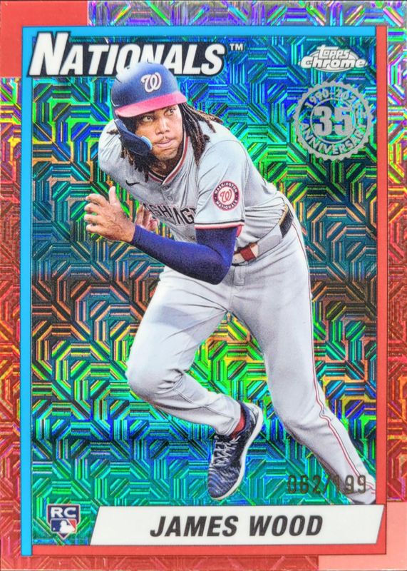 The James Wood 2025 Topps #T90C-145 1990 Baseball Chrome Silver Pack - Aqua Refractor /199 Rookie card is 1 of 333 James Wood's card variations in the 2025 Topps set being tracked by Sports Card Investor, including Base, Aqua Holo Foil, Aqua Rainbow, Diamante Foil, and Eggs.