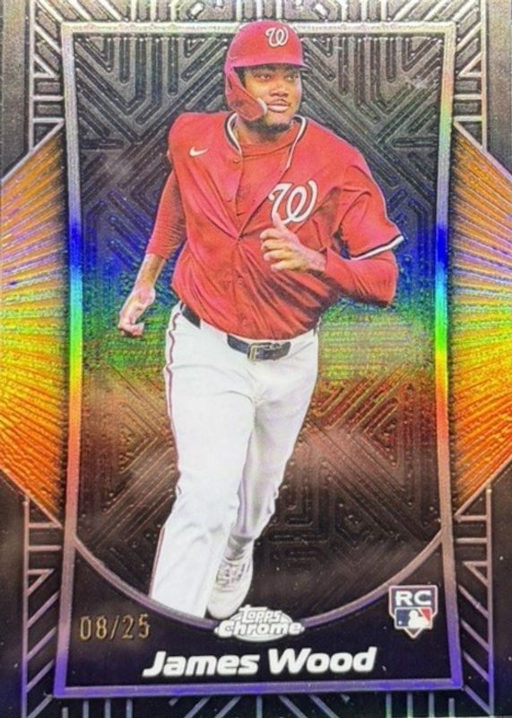 The James Wood 2025 Topps Chrome #SE-13 Shadow Etch - Orange Refractor /25 Rookie card in Raw condition has not changed in price in the last 30 days and was last sold for $89.00 .