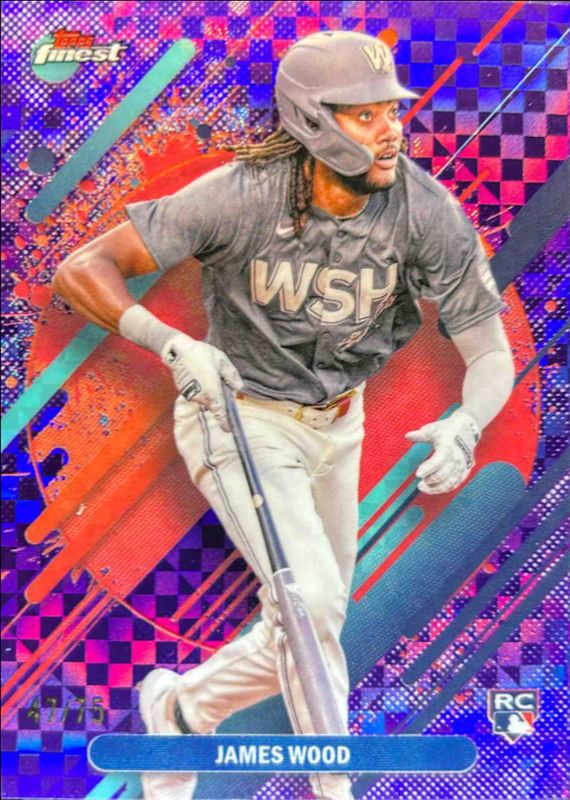 The James Wood 2025 Topps Finest #300 Base Rare - Purple X-Fractor /75 Rookie card is 1 of 170 James Wood's card variations in the 2025 Topps Finest set being tracked by Sports Card Investor, including Common, Rare, Uncommon, Common - Checkerboard Refractor, and Common - Refractor.