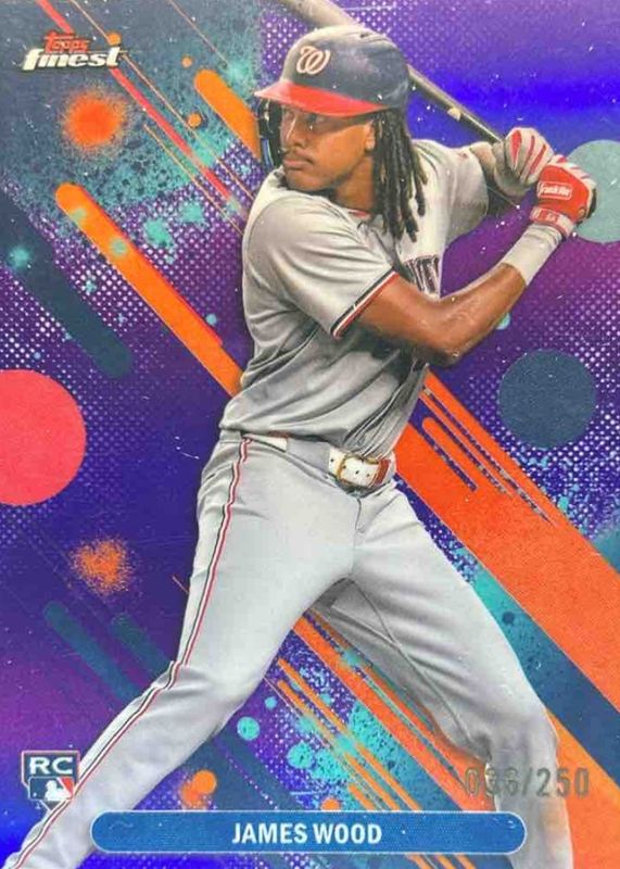 The James Wood 2025 Topps Finest #100 Common - Purple Refractor /250 Rookie card in Raw condition has moved up $0.39 (+4.6%) in the last 30 days and was last sold for $8.89 .