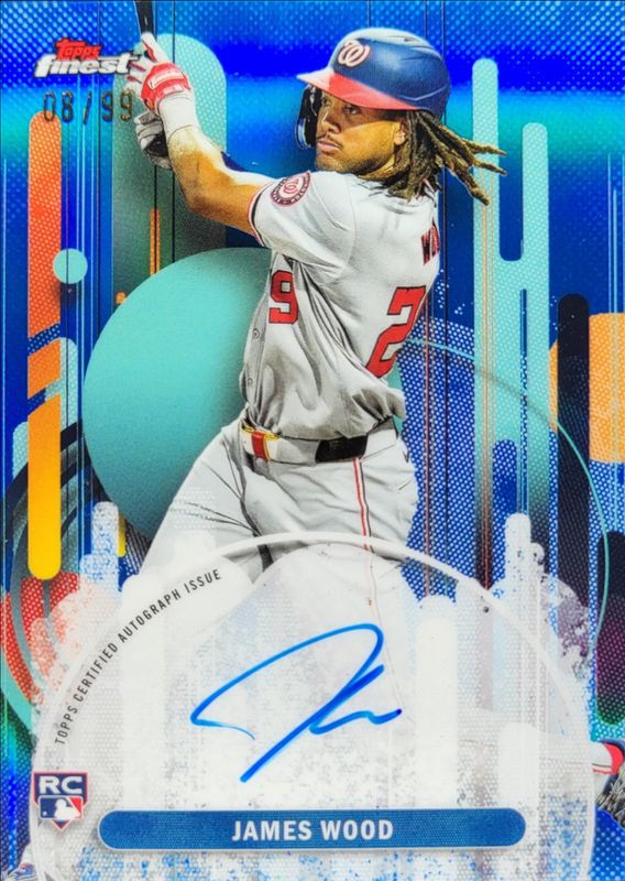 The James Wood 2025 Topps Finest #FA-JWO Finest Autographs - Blue Refractor /99 Rookie card is 1 of 170 James Wood's card variations in the 2025 Topps Finest set being tracked by Sports Card Investor, including Common, Rare, Uncommon, Common - Checkerboard Refractor, and Common - Refractor.