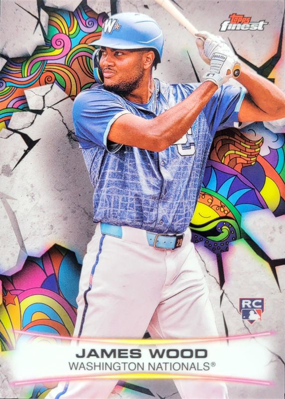 The James Wood 2025 Topps Finest #S-17 Smashing Through Rookie card is 1 of 170 James Wood's card variations in the 2025 Topps Finest set being tracked by Sports Card Investor, including Common, Rare, Uncommon, Common - Checkerboard Refractor, and Common - Refractor.