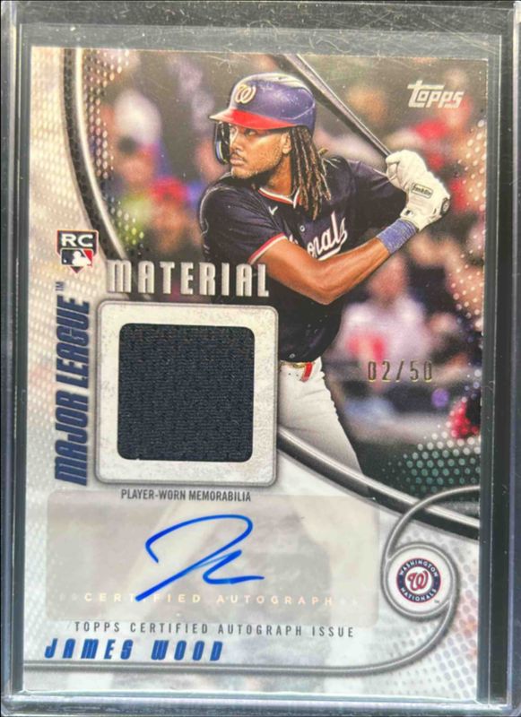 The James Wood 2025 Topps #MLMA2-JWO Major League Material Autographs (Series Two) /50 Rookie card is 1 of 333 James Wood's card variations in the 2025 Topps set being tracked by Sports Card Investor, including Base, Aqua Holo Foil, Aqua Rainbow, Diamante Foil, and Eggs.