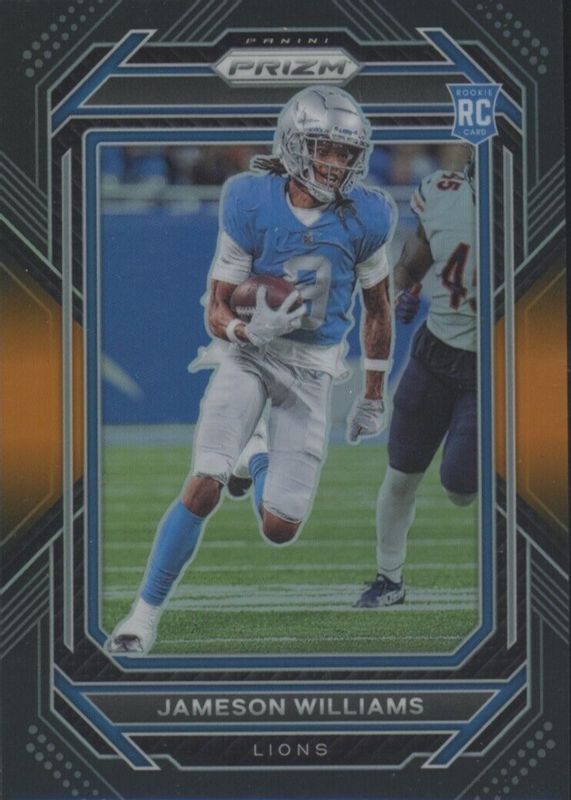 The Jameson Williams 2022 Chronicles #PB-13 Prizm Black - Orange /75 Rookie card in Raw condition has not changed in price in the last 30 days and was last sold for $10.50 .