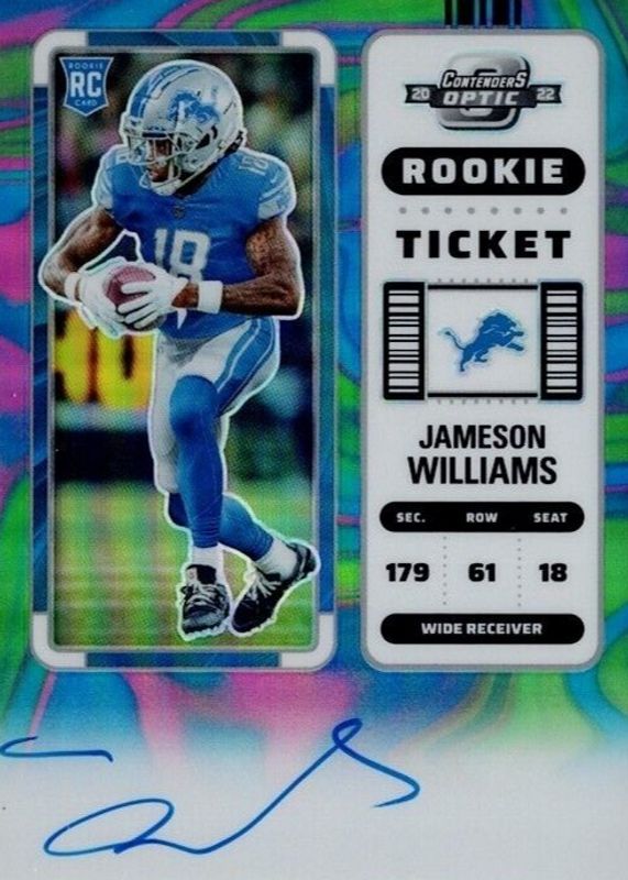 Jameson Williams 2022 Contenders Optic #124 Rookie Ticket Auto - Neon Marble /4 RAW Price Guide