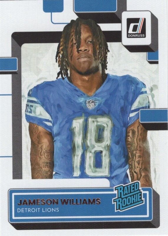 This card is 1 of 49 Jameson Williams' card variations in the 2022 Donruss set being tracked by Sports Card Investor, including Base, Aqueous Test, Jersey Number (/18), No Name, and Optic Preview.