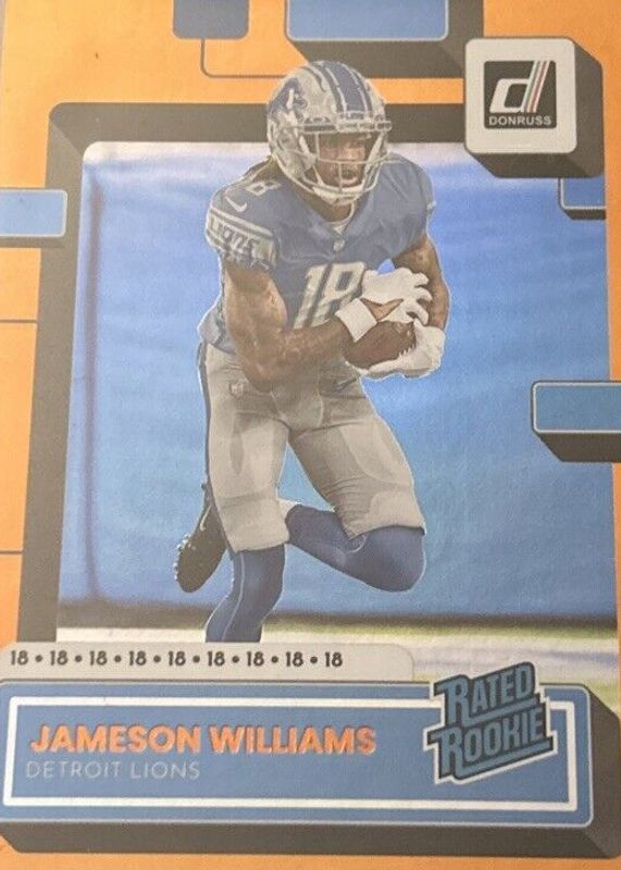 The Jameson Williams 2022 Donruss #308 Jersey Number (/18) Rookie card in Raw condition has not changed in price in the last 30 days and was last sold for $60.00 .