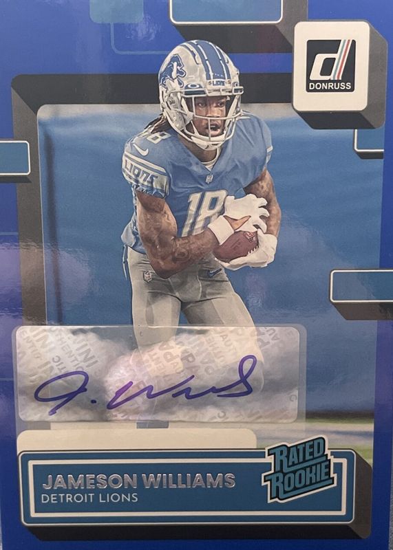 The Jameson Williams 2022 Donruss #308 Rated Rookie Autographs - Blue card in Raw condition has not changed in price in the last 30 days and was last sold for $51.00 .