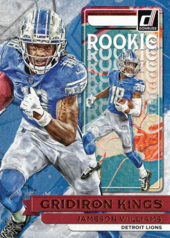 The Jameson Williams 2022 Donruss #RGK-7 Rookie Gridiron Kings card in Raw condition has moved up $0.26 (+26.3%) in the last 30 days and was last sold for $1.25 .