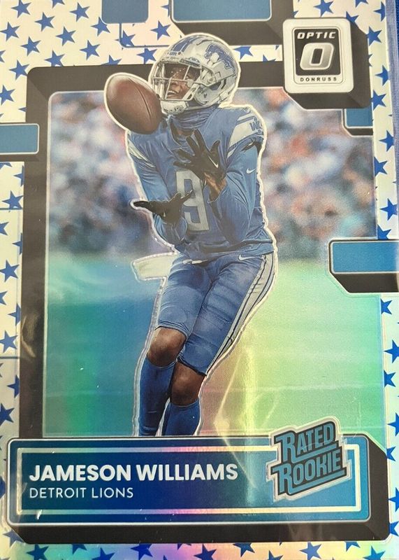 The Jameson Williams 2022 Optic #208 Stars /(SSP) Rookie card in Raw condition has not changed in price in the last 30 days and was last sold for $18.25 .