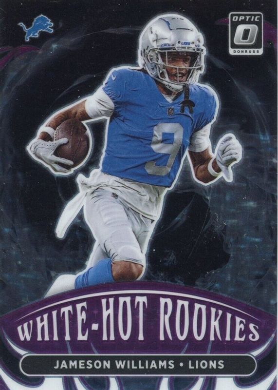 The Jameson Williams 2022 Optic #WHR-4 White Hot Rookies - Purple Stars /25 card in Raw condition has not changed in price in the last 30 days and was last sold for $18.38 .
