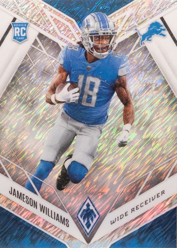The Jameson Williams 2022 Phoenix #108 White Shimmer /(SSP) Rookie card in Raw condition has not changed in price in the last 30 days and was last sold for $16.76 .