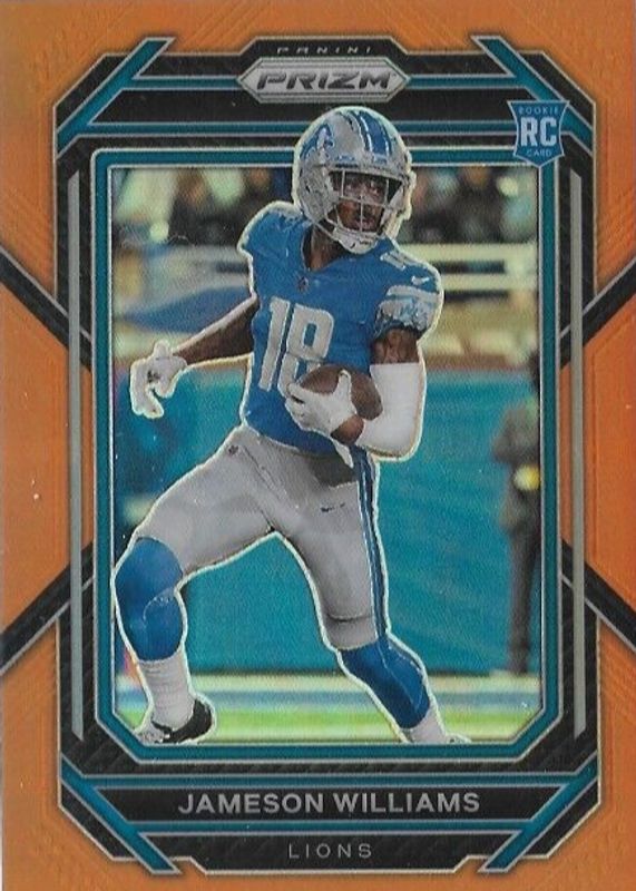 The Jameson Williams 2022 Prizm #311 Orange /249 Rookie card in Raw condition has moved up $7.00 (+50.0%) in the last 30 days and was last sold for $21.00 .