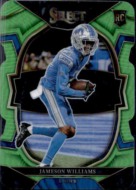 The Jameson Williams 2022 Select #57 Concourse Neon Green Die-Cut /299 Rookie card in Raw condition has moved down -$0.80 (-8.0%) in the last 30 days and was last sold for $9.20 .