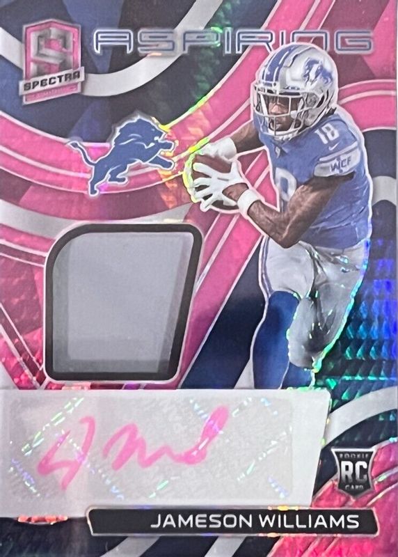 The Jameson Williams 2022 Spectra #APA-JWI Aspiring Patch Autographs - Neon Pink /25 Rookie card in Raw condition has not changed in price in the last 30 days and was last sold for $76.00 .