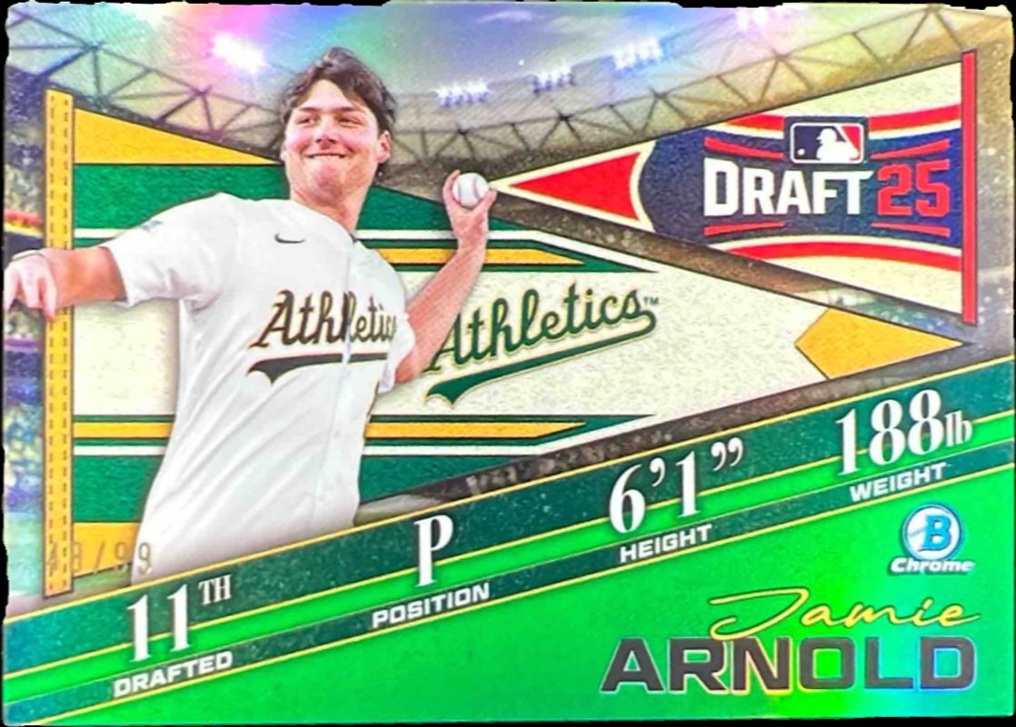 Jamie Arnold 2025 Bowman Draft #BDN-9 Bowman Draft Night - Green Refractor /99 RAW Price Guide