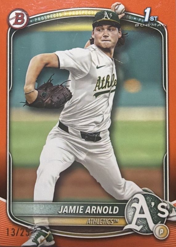 The Jamie Arnold 2025 Bowman Draft #BD-146 Orange Border /25 (1st) card in Raw condition has moved up $6.00 (+8.7%) in the last 30 days and was last sold for $75.00 .