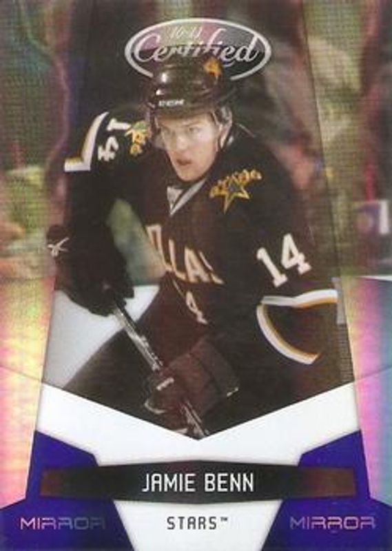 The Jamie Benn 2010 Certified #47 Mirror Blue /50 card is 1 of 42 Jamie Benn's card variations in the 2010 Certified set being tracked by Sports Card Investor, including Base /799, Platinum Red /999, Platinum Blue /250, Mirror Red Materials Dual /150, and Mirror Blue Materials /100.