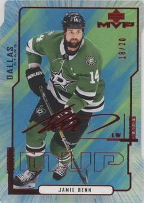The Jamie Benn 2020 Upper Deck MVP #75 Colors & Contours Green /20 card is 1 of 18 Jamie Benn's card variations in the 2020 Upper Deck MVP set being tracked by Sports Card Investor, including Base, Blue, Gold Script, Puzzle Backs, and Silver Script.