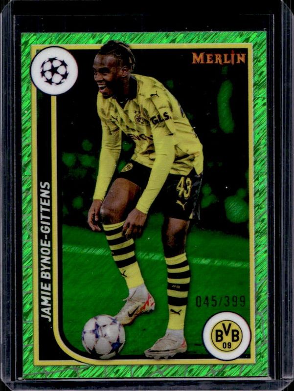 The Jamie Bynoe-Gittens 2023 Topps Merlin Chrome UEFA Club Competitions #25 Neon Green Shimmer Refractor /399 card is 1 of 39 Jamie Bynoe-Gittens' card variations in the 2023 Topps Merlin Chrome UEFA Club Competitions set being tracked by Sports Card Investor, including Base, Aqua Prism Refractor, Refractor, Vintage Merlin Refractor, and Rose Gold Shimmer Refractor /299.