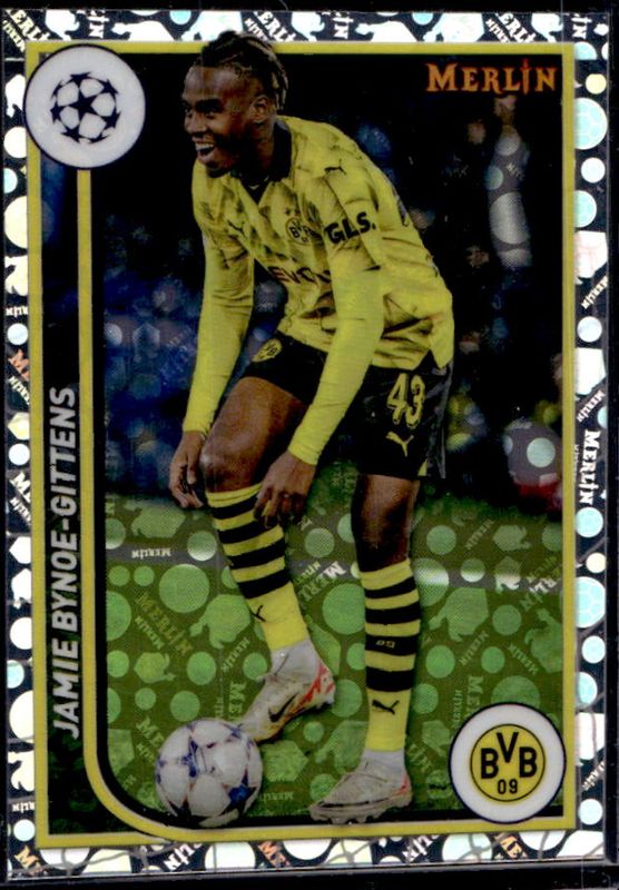The Jamie Bynoe-Gittens 2023 Topps Merlin Chrome UEFA Club Competitions #25 Vintage Merlin Refractor card is 1 of 39 Jamie Bynoe-Gittens' card variations in the 2023 Topps Merlin Chrome UEFA Club Competitions set being tracked by Sports Card Investor, including Base, Aqua Prism Refractor, Refractor, Neon Green Shimmer Refractor /399, and Rose Gold Shimmer Refractor /299.