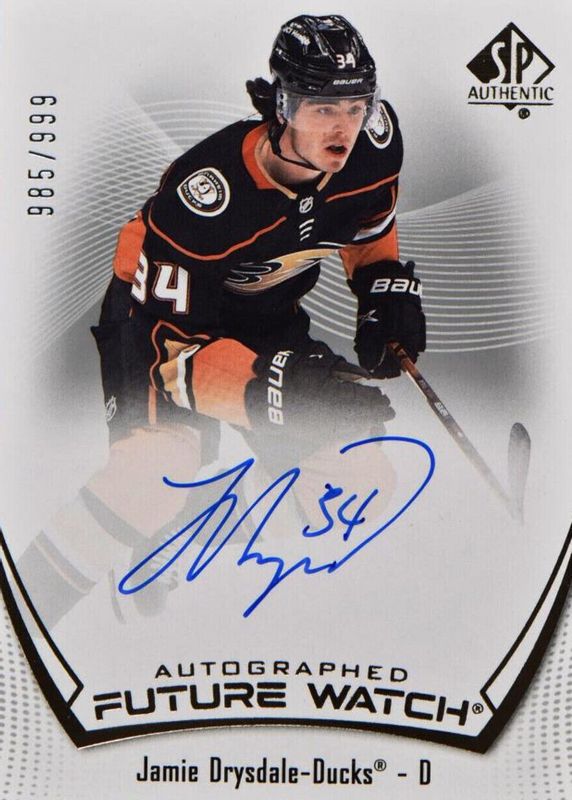 Jamie Drysdale's Hockey cards are available in at least 55 sets. Jamie Drysdale's biggest 7-day price movers are 2021 SP Authentic #132 Future Watch Auto /999, 2021 Upper Deck #205 Young Guns - Jumbo, and 2022 Topps Chrome NHL Sticker Collection #15 Red Refractor /5.