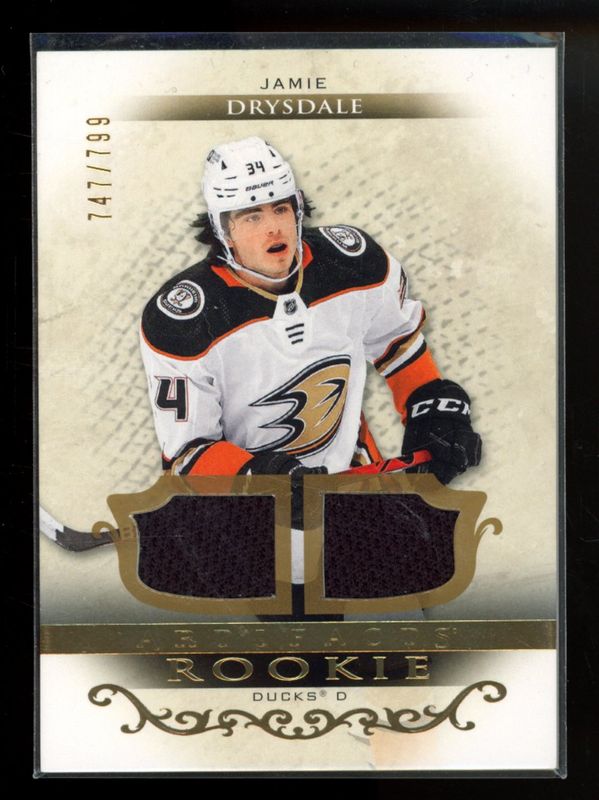 The Jamie Drysdale 2021 Upper Deck Artifacts #175 Material - Gold /199 Rookie card is 1 of 37 Jamie Drysdale's card variations in the 2021 Upper Deck Artifacts set being tracked by Sports Card Investor, including Base /999, Neon Green, Rose Gold, Turquoise, and Ruby /499.
