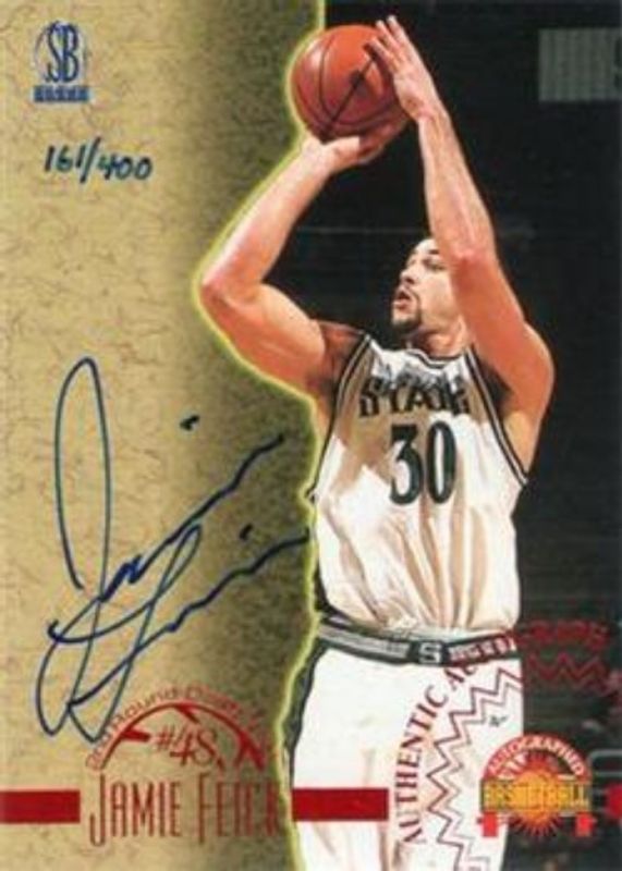 The Jamie Feick 1996 Score Board Autographed Autographs - Red /400 card is 1 of 4 Jamie Feick's card variations in the 1996 Score Board Autographed set being tracked by Sports Card Investor, including Base, Autographs, and Autographs - Silver /325.