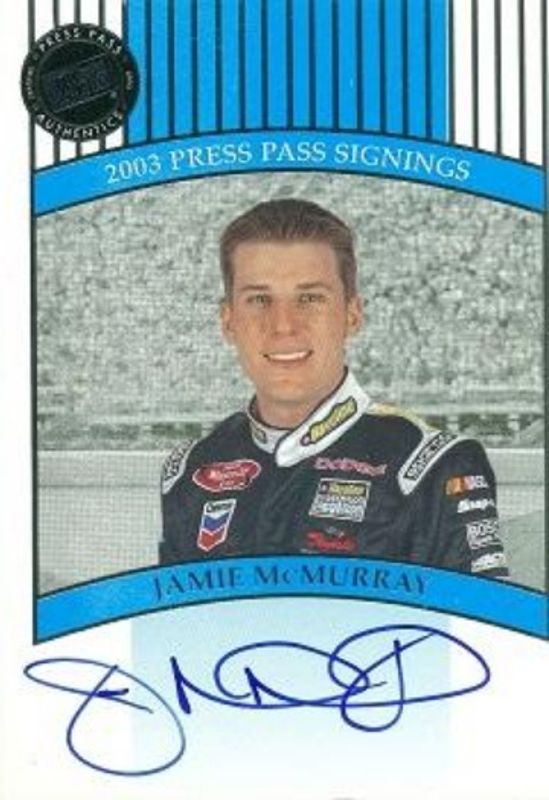 The Jamie McMurray 2003 Press Pass Premium Signings Rookie card is 1 of 6 Jamie McMurray's card variations in the 2003 Press Pass Premium set being tracked by Sports Card Investor, including Crusade, Beckett Samples, Red Reflectors, eBay Previews /5, and Signings Gold /50.