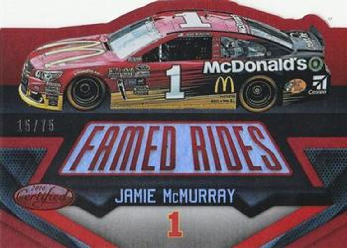 The Jamie McMurray 2016 Certified NASCAR #FR15 Famed Rides - Mirror Red /75 card is 1 of 54 Jamie McMurray's card variations in the 2016 Certified NASCAR set being tracked by Sports Card Investor, including Base /99, Mirror Red /25, Mirror Blue /20, Mirror Gold /15, and Mirror Orange /15.