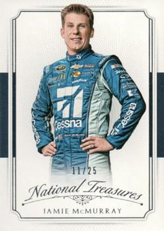 The Jamie McMurray 2016 National Treasures NASCAR #13 Base /25 card is 1 of 96 Jamie McMurray's card variations in the 2016 National Treasures NASCAR set being tracked by Sports Card Investor, including Century Silver /20, Century Gold /15, Century Black /5, Century Blue /1, and Printing Plates Black /1.
